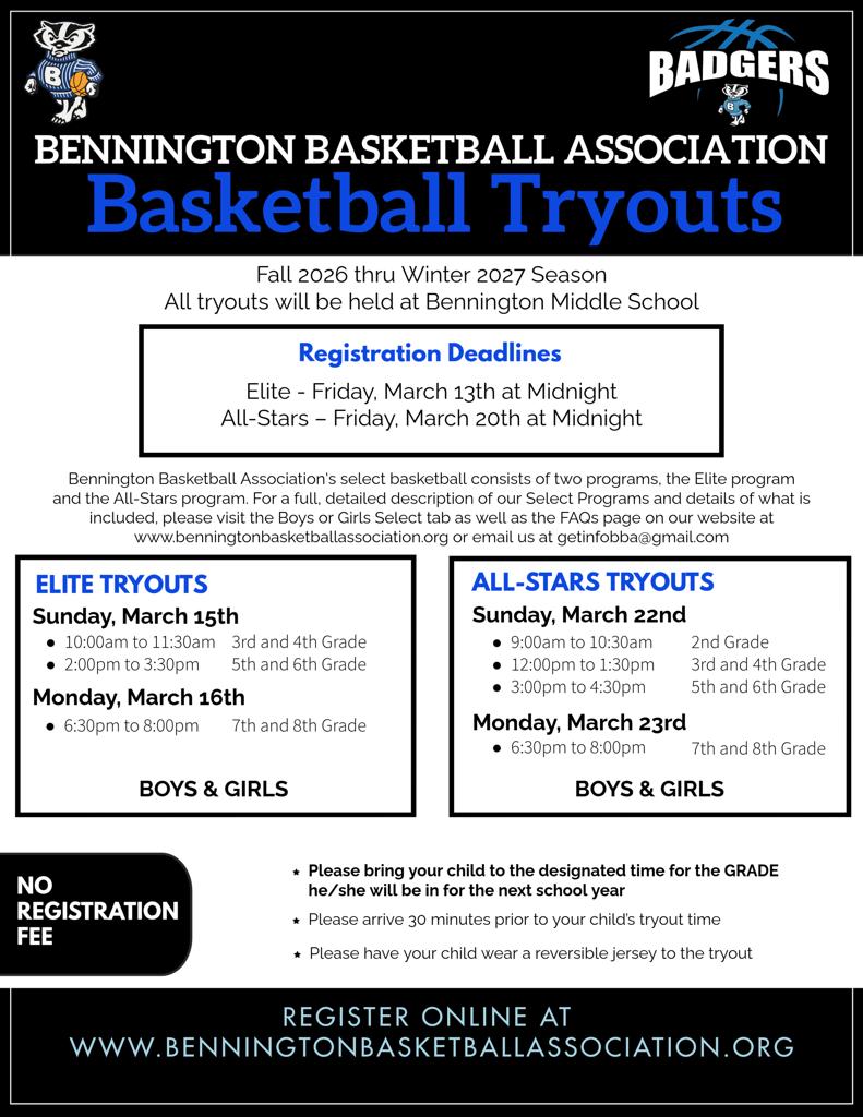 The Bennington Basketball Association’s mission is to teach, develop, organize, manage and offer youth players the opportunity to learn the fundamental skills of basketball while instilling life-lessons and values such as character, team work, discipline, respect and sportsmanship.